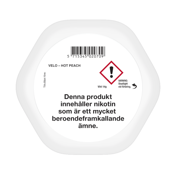 VELO Shift Hot Peach från VELO har smak av persika, produkten klassificeras som stark, levereras i ett slim-format och varje dosa innehåller 20 portioner vitt snus.